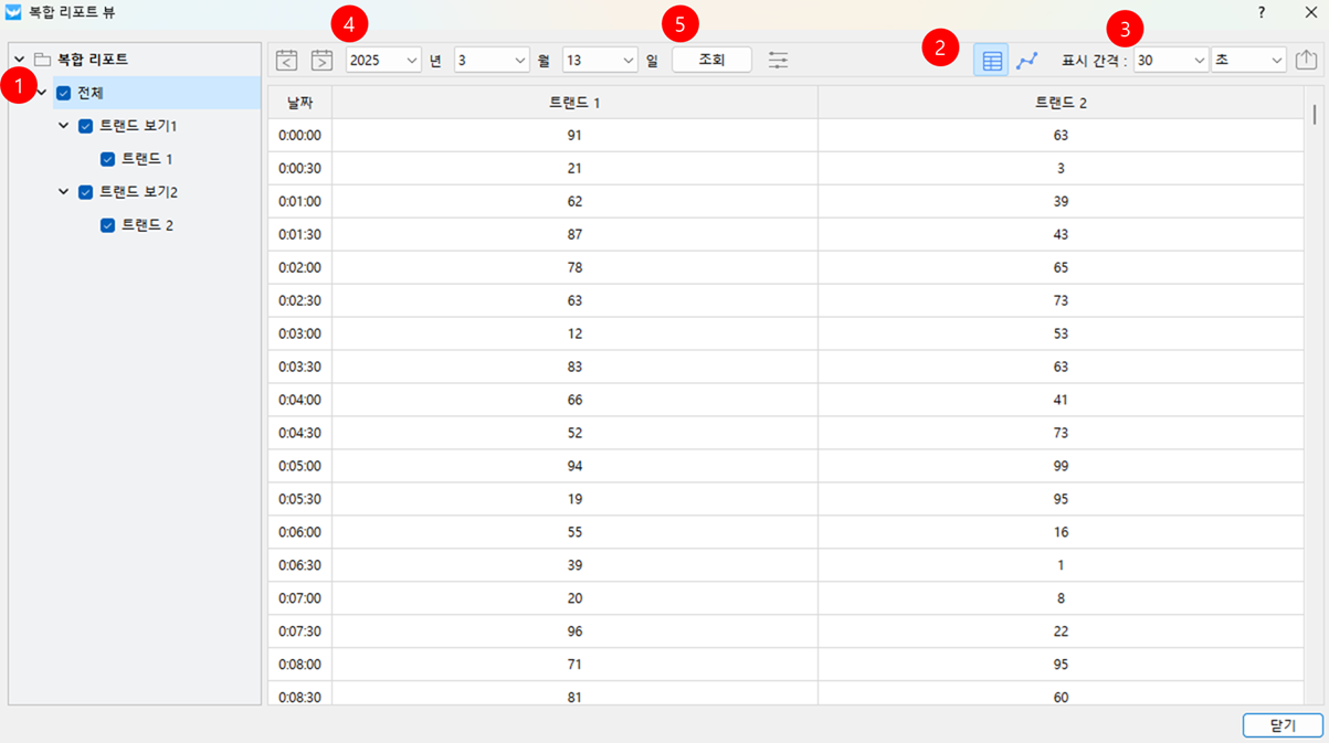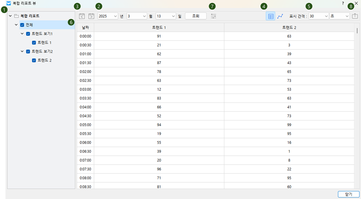 복합 리포트 뷰에서는 기본적으로 특정 날짜 하루 데이터를 표시합니다. 기간 조회 창을 호출하면 특정 기간의 데이터를 조회할 수 있습니다. |
