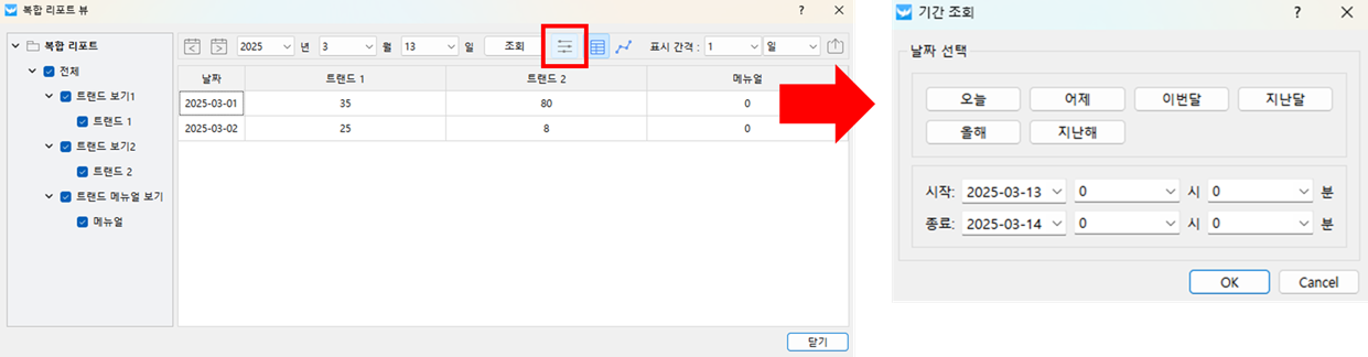 파워씬 HMI기능정보창 메뉴복합 리포트 보기 기간 조회 복합 리포트 뷰에서는 기본적으로 특정 날짜 하루 데이터를 표시합니다. 기간 조회 창을 호출하면 특정 기간의 데이터를 조회할 수 있습니다. 조회하고 싶은 기간을 선택 후 OK 버튼을 클릭하면 데이터를 조회합니다.