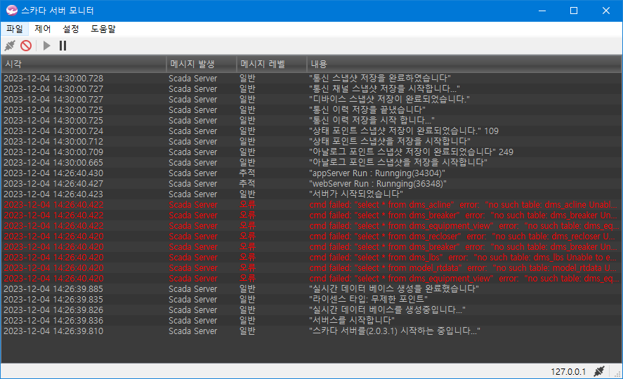 3. 연결이 완료되면 '스카다 서버' 프로그램 연결이 완료 되며 메시지 창에 서버 프로그램의 실행 상태가 표시 됩니다. 일반적으로 하얀색 메시지는 정상적으로 처리된 메시지이며, 붉은색 메시지는 데이터 처리 중 문제가 발생한 것을 나타냅니다.