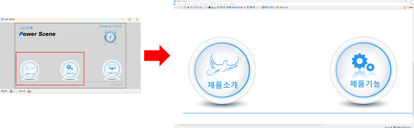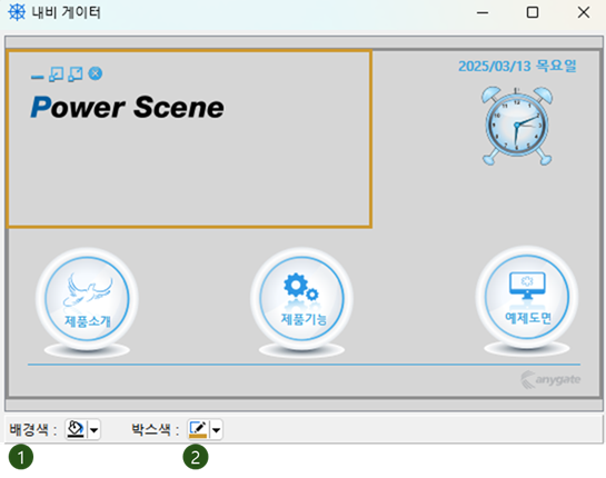 파워씬 HMI기능보기 메뉴 내비 게이터 내비 게이터에서 파워씬 전체 캔버스 영역 중 HMI 화면에 표시되는 영역을 사각형 박스로 표시합니다. 내비 게이터 박스를 이동시키면 박스 화면에 맞춰서 파워씬 HMI 화면이 이동합니다. 분류 설명 (1) 배경색 내비 게이터 화면에 보이는 전체 배경색을 변경합니다. (2) 박스색 내비 게이터 화면에 보이는 내비 게이터 박스 테두리 색상을 변경합니다.