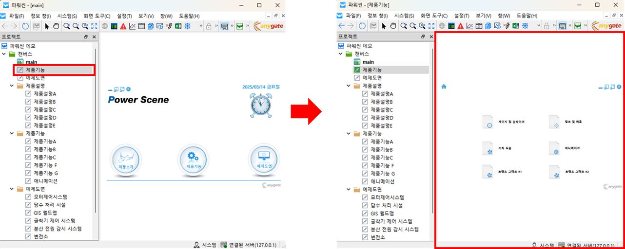 파워씬 HMI기능보기 메뉴 프로젝트 파워씬 스튜디오에서 구성한 캔버스 리스트 정보를 트리 구조로 확인할 수 있습니다. 프로젝트 화면에서 캔버스를 더블 클릭하면 해당 캔버스를 메인 화면에 표시합니다.