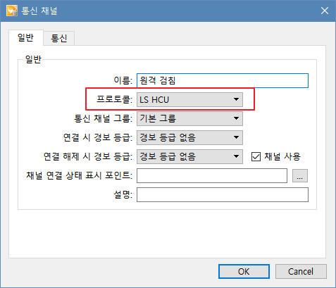 ② 일반 탭의 통신 채널 항목에서 통신 채널 설정에서 입력했던 통신 채널을 선택합니다.
