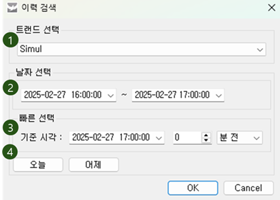 파워씬 HMI기능정보창 메뉴트랜드 보기 트랜드 이력 검색 이력으로 불러올 트랜드 정보를 설정합니다. 이력으로 보고 싶은 정보를 선택 후 OK 버튼을 클릭하면 트랜드 정보를 표시합니다. 분류 설명 (1) 트랜드 선택 이력으로 불러올 트랜드를 표시합니다. (2) 날짜 선택 검색할 시간을 입력합니다. (3) 빠른 선택 검색할 시간을 간편하게 입력합니다. (4) 최근 데이터 검색 기간을 어제 혹은 오늘 시간으로 입력합니다.