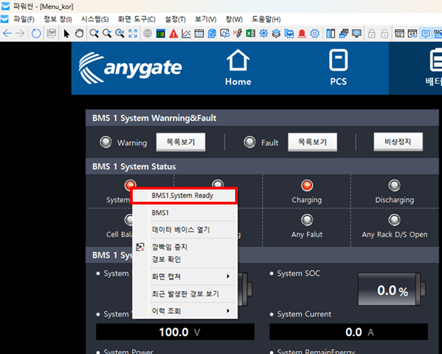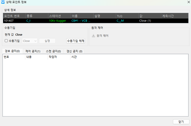 포인트 상세 정보 화면은 스카다 요약 화면의 스테이션 요약, 태깅 요약, 비정상데이터 요약 화면에서 포인트의 컨텍스트 메뉴를 이용해 팝업 하거나 파워씬 화면에서 포인트 관련 컨텍스트 메뉴를 클릭하여 실행할 수 있습니다.