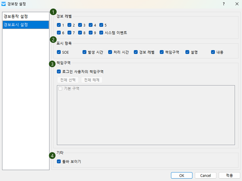 경보 설정 창에서는 경보와 관련된 기본 설정과 경보 표시 관련 설정을 할 수 있습니다.