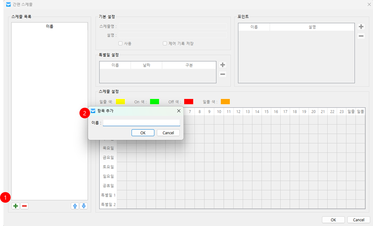 파워씬 HMI기능정보창 메뉴스케줄 설정 스케줄 리스트 설정 사용자가 등록한 스케줄 리스트를 표시하고 스케줄 추가 및 삭제 등의 편집을 합니다. 스케줄 추가 : '+' 버튼을 클릭 후 항목 추가 화면이 나오면 스케줄 명을 입력합니다. OK 버튼을 클릭하면 스케줄 목록 테이블에 해당 스케줄명이 추가 됩니다. 스케줄 삭제 : 삭제할 스케줄을 선택 후 '-' 버튼을 클릭합니다. 스케줄 삭제 경고 메시지가 뜨면 OK 버튼을 클릭합니다. 스케줄 수정 : 수정할 스케줄을 선택 후 우측 화면에 있는 기본 설정, 포인트 설정, 특별일 설정, 스케줄 설정 항목을 수정합니다.