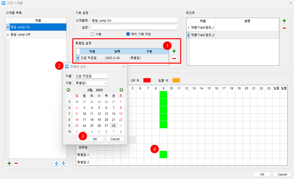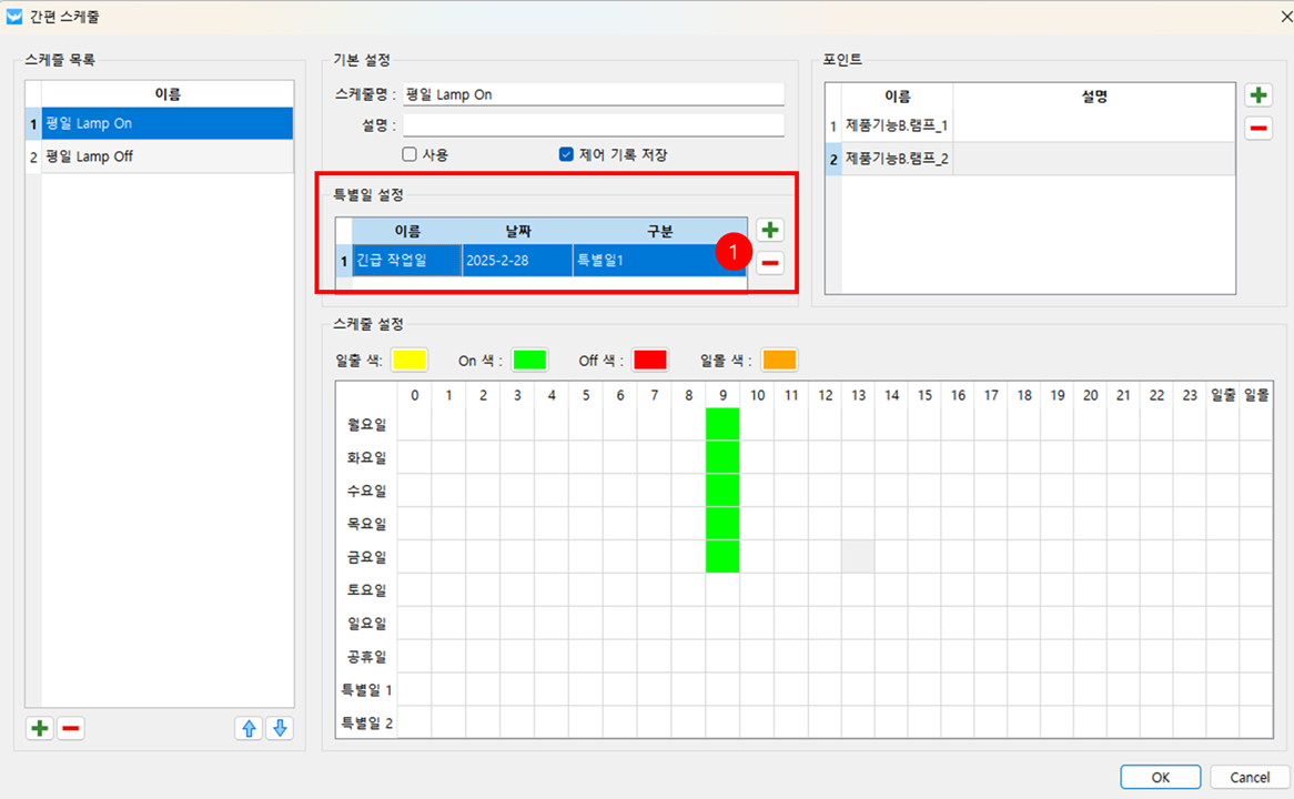 - 특별일 추가 : '+' 버튼을 클릭 하면 특별일 설정 창을 불러옵니다. 추가하고자 하는 특별일 정보를 입력 후 OK 버튼을 클릭하면 특별일에 추가 됩니다. 특별일 추가 후 스케줄 설정 화면에서 특별일의 작업을 추가합니다.