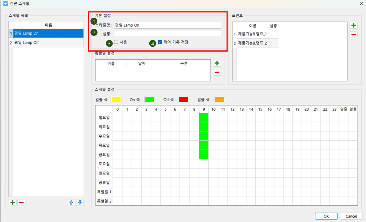 파워씬 HMI기능정보창 메뉴스케줄 설정 기본 설정 스케줄명, 사용 유무 등 스케줄의 기본 설정 정보를 편집합니다. 분류 설명 (1) 스케줄명 스케줄명을 입력합니다. 입력한 스케줄명은 스케줄 목록에 표시됩니다. (2) 설명 스케줄에 대한 설명을 표시합니다. (3) 사용 스케줄 사용 유무를 선택합니다. (4) 제어 기록 저장 제어 기록 저장 유무를 선택합니다.