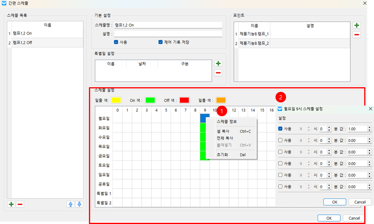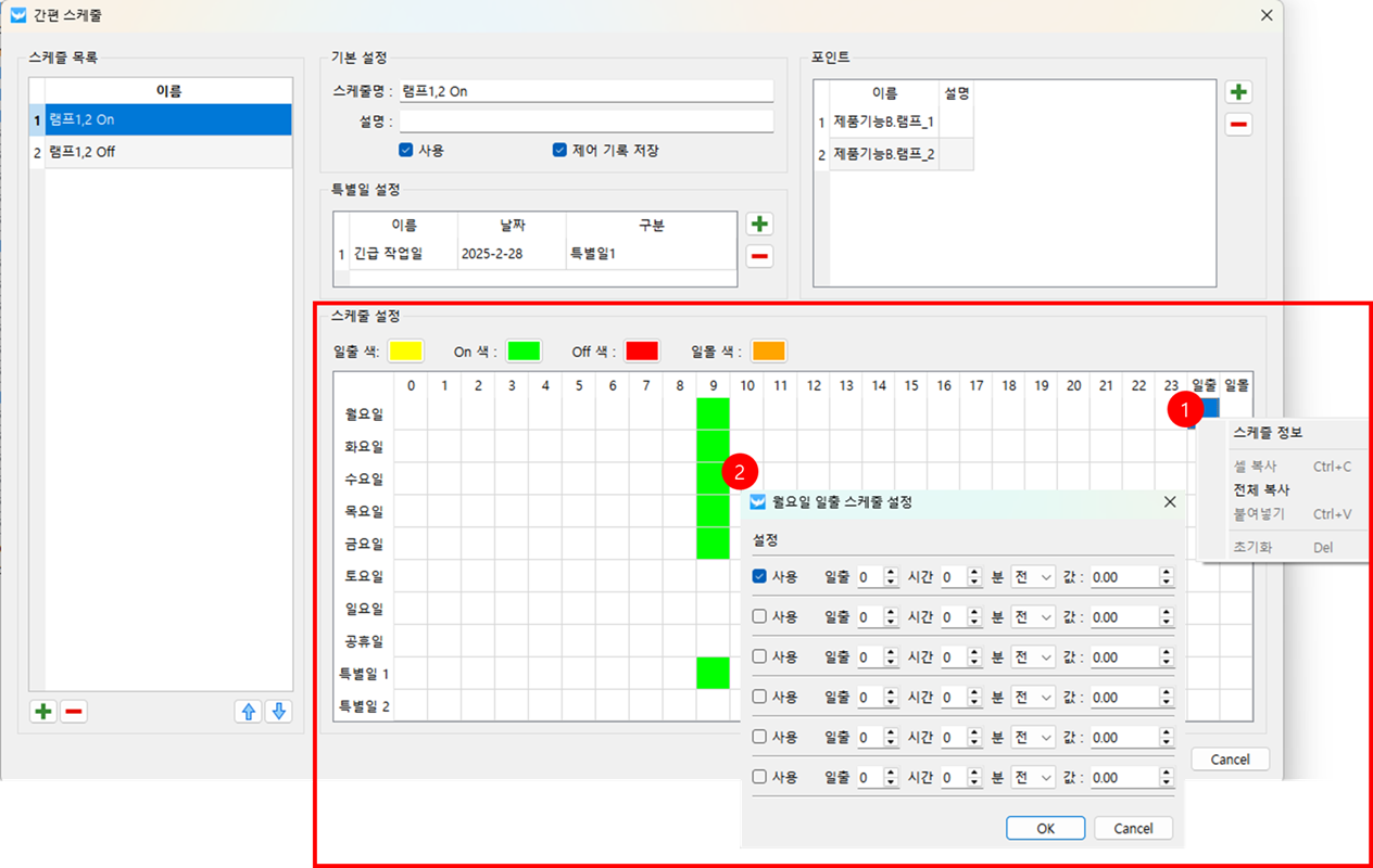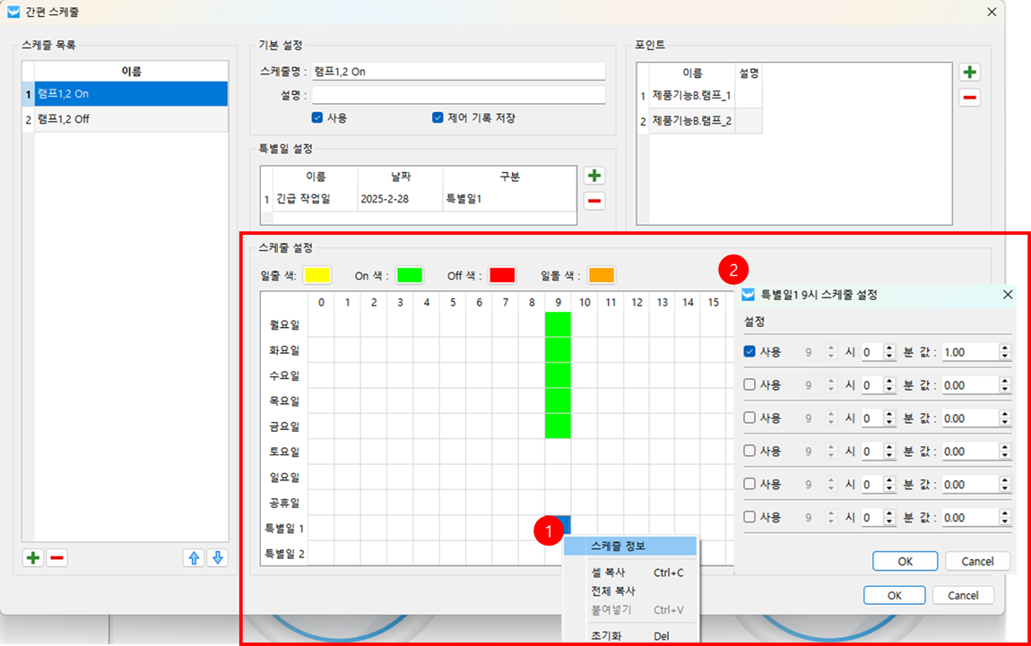 특정한날에 일정을 추가하고 싶은 경우 특별일 설정 화면에서 특별일을 먼저 추가하고 추가한 특별일1 혹은 특별일2의 원하는 시간에서 마우스 우클릭 후 스케줄 정보를 클릭하여 스케줄 정보를 입력합니다.