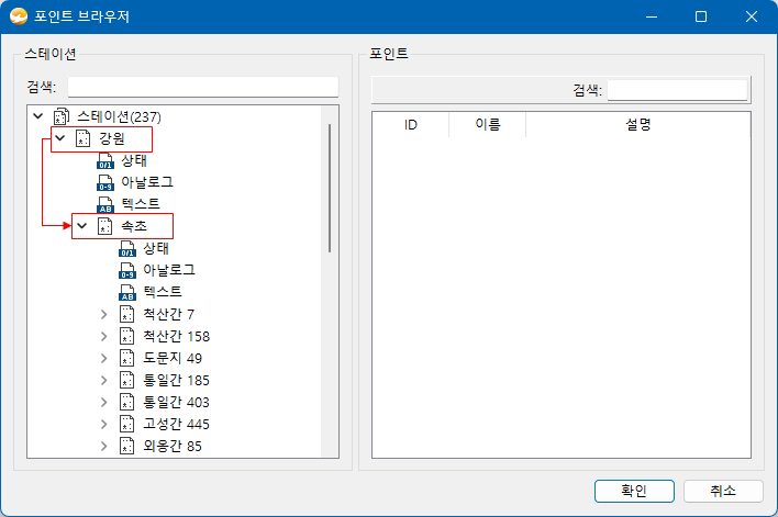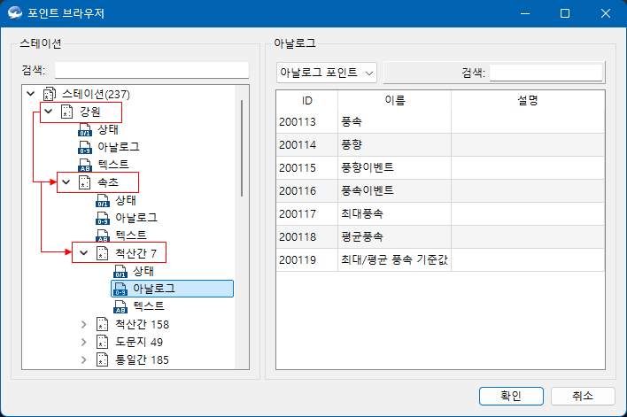 스테이션에 속한 아날로그 포인트 이름 목록을 조회합니다. 아래 예제에서는 그림과 같은 스테이션 구조에서 '강원.속초.척산간 7' 스테이션에 속한 아날로그 포인트 목록을 읽어오는 방법을 보여줍니다.
