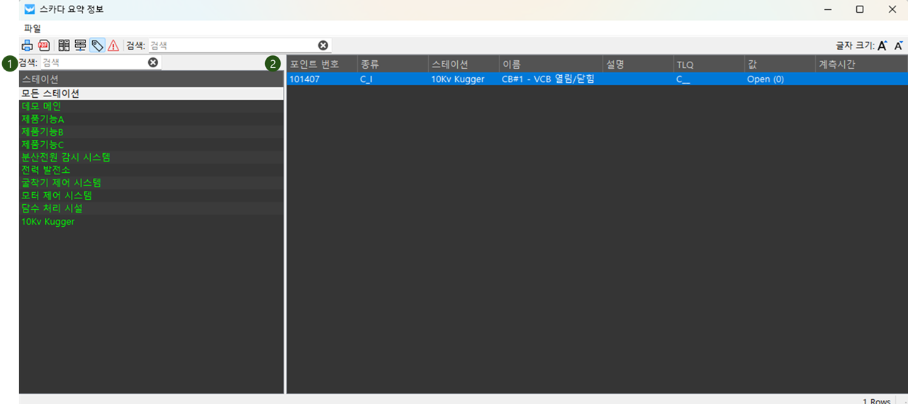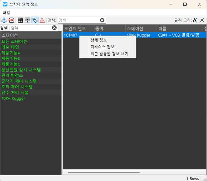파워씬에서 운영 중인 스테이션 정보를 표시합니다. '모든 스테이션' 선택시 태그 설정이 되어 있는 모든 포인트를 우측 포인트 정보 리스트에 표시합니다. |