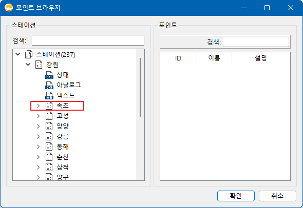 주어진 이름의 스테이션 정보를 반환 합니다. • path : 읽어오려는 스테이션 이름을 나타 냅니다. 아래와 같은 스테이션 계층 구조에서 '속초' 스테이션을 읽기 위해서는 상위 스테이션을 포함한 전체 경로을 입력 합니다. >> station = getStation('강원.속초')